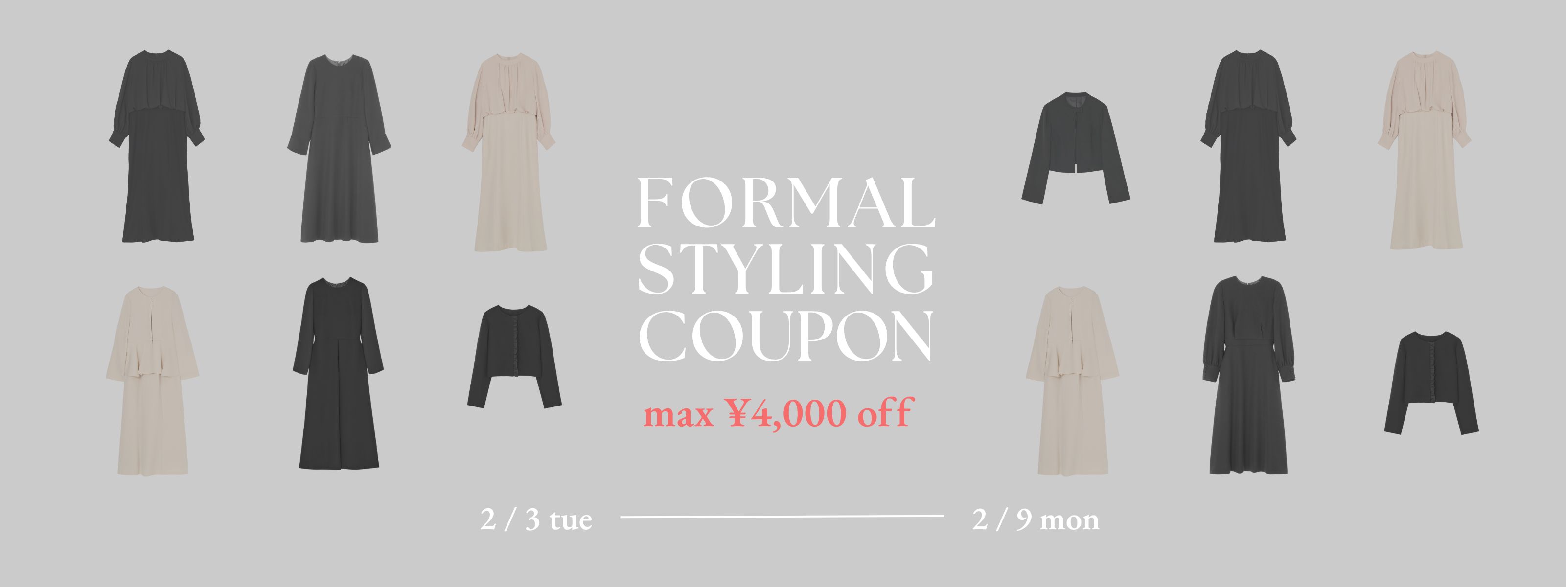 フォーマルワンピースを対象に、ジャケット・シューズ・バッグとのコーディネートでご利用いただけるスタイリングクーポンをご用意しました。組み合わせに応じて、お得にフォーマルスタイルをお楽しみいただけます。
