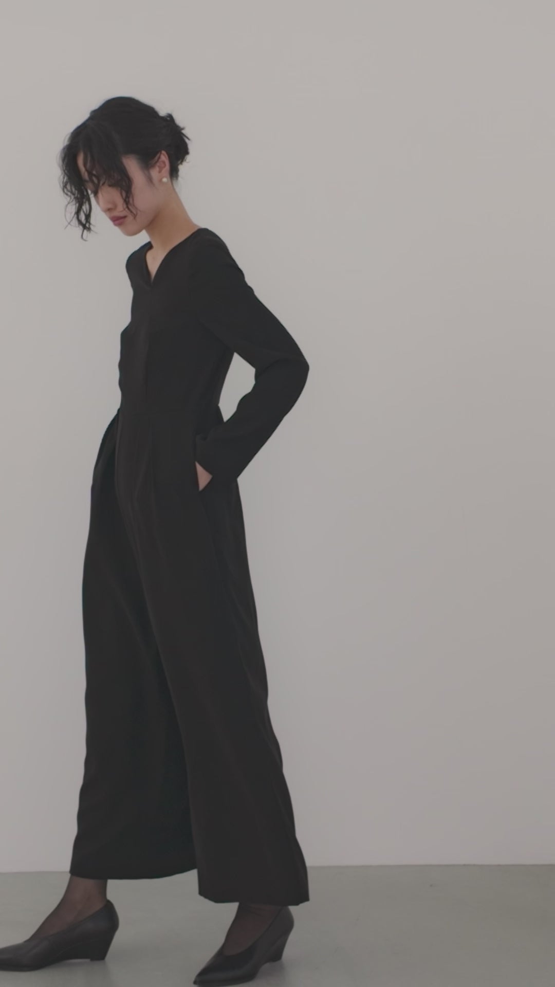 少しカーブさせたネックラインが印象的な、ブラックフォーマル素材のオールインワン。